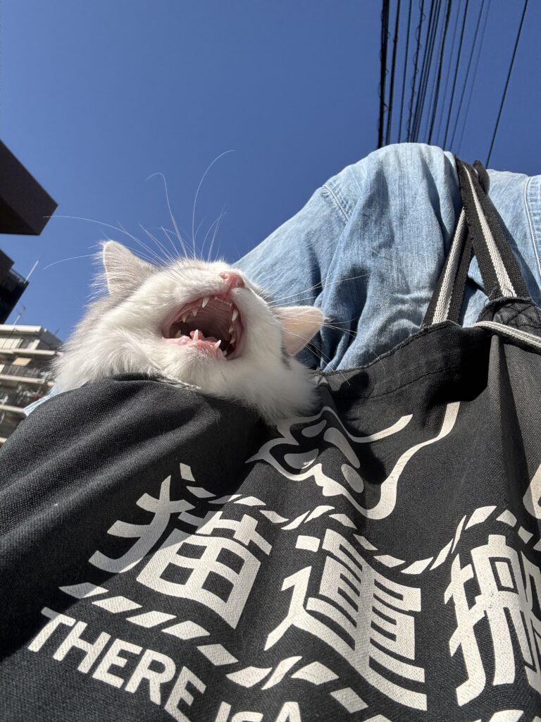なんとお客様がお持ちのトートバッグ「猫運搬中」の中に入っているのです。