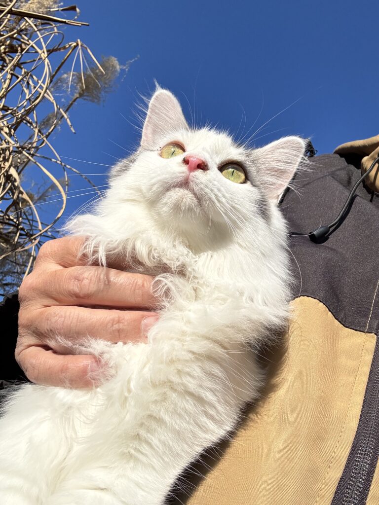 シェルパーカー「3CATS」を着用されているお客様と可愛い猫ちゃんのお写真です。